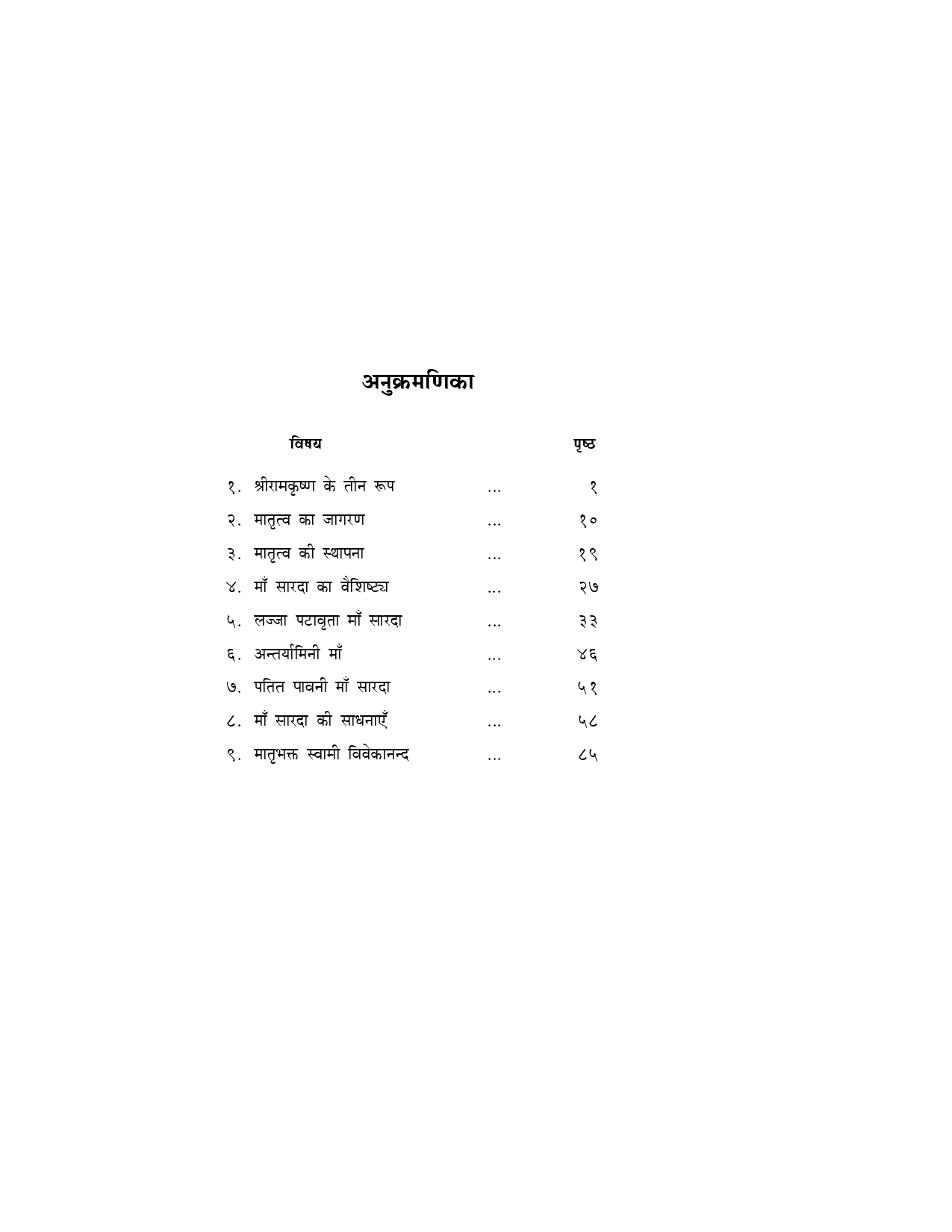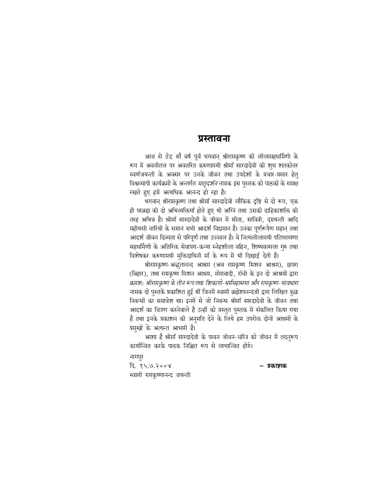 आज से डेढ़ सौ वर्ष पूर्व भगवान् श्रीरामकृष्ण की लीलासहधर्मिणी के रूप में अवनीतल पर अवतरित करुणामयी श्रीमाँ सारदादेवी की शुभ शतकोत्तर स्वर्णजयन्ती के अवसर पर उनके जीवन तथा उपदेशों के प्रचार-प्रसार हेतु विश्वव्यापी कार्यक्रमों के अन्तर्गत मातृदर्शन नामक इस पुस्तक को पाठकों के समक्ष रखते हुए हमें अत्यधिक आनन्द हो रहा है। भगवान् श्रीरामकृष्ण तथा श्रीमाँ सारदादेवी लौकिक दृष्टि से दो रूप, एक ही परब्रह्म की दो अभिव्यक्तियाँ होते हुए भी आग्न तथा उसकी दाहिकाशक्ति की तरह अभिन्न हैं। श्रीमाँ सारदादेवी के जीवन में सीता, सावित्री, दमयन्ती आदि महीयसी नारियों के समान सभी आदर्श विद्यमान हैं। उनका पूर्णरूपेण महान् तथा आदर्श जीवन दिव्यता से परिपूर्ण तथा उज्ज्वल है। वे नित्यलीलामयी पतिपरायणा सहधर्मिणी के अतिरिक्त सेवापरा-कन्या स्नेहशीला बहिन, शिष्यवत्सला गुरु तथा विशेषकर करुणामयी मुक्तिदायिनी माँ के रूप में भी दिखाई देती हैं।