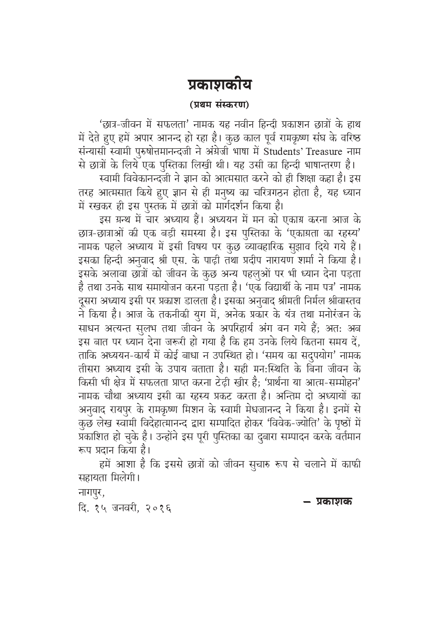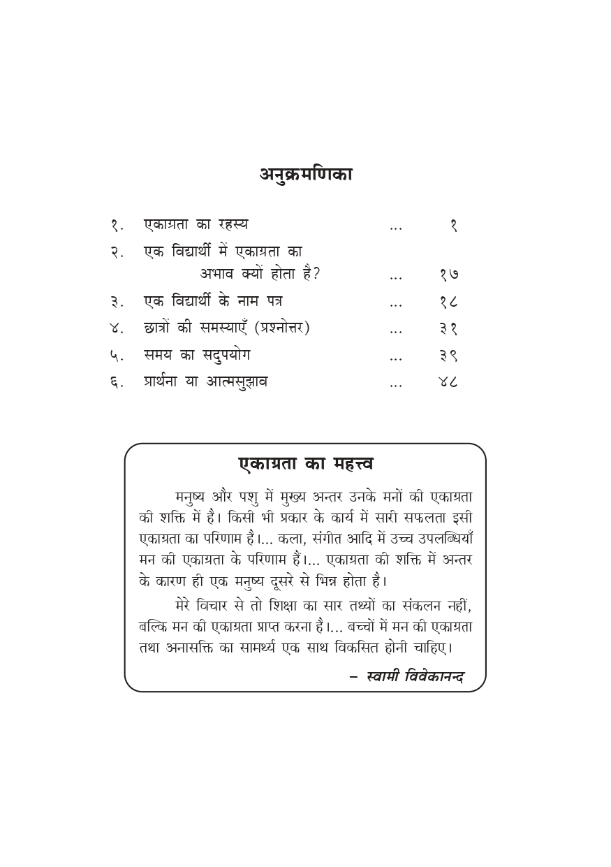 इस ग्रन्थ में चार अध्याय हैं । अध्ययन में मन को एकाग्र करना आज के छात्र-छात्राओं की एक बड़ी समस्या है । इस पुस्तक के ‘एकाग्रता का रहस्य’ नामक पहले अध्याय में इसी विषय पर कुछ व्यावहारिक सुझाव दिये गये हैं । इसका हिन्दी अनुवाद श्री एस. के पाढ़ी तथा प्रदीप नारायण शर्मा ने किया है । इसके अलावा छात्रों को जीवन के कुछ अन्य पहलुओं पर भी ध्यान देना पड़ता है तथा उनके साथ समायोजन करना पड़ता है । ‘एक विद्यार्थी के नाम पत्र’ नामक दूसरा अध्याय इसी पर प्रकाश डालता है । इसका अनुवाद श्रीमती निर्मल श्रीवास्तव ने किया है । आज के तकनीकी युग में, अनेक प्रकार के यंत्र तथा मनोरंजन के साधन अत्यन्त सुलभ तथा जीवन के अपरिहार्य अंग बन गये हैं; अत: अब इस बात पर ध्यान देना जरूरी हो गया है कि हम उनके लिये कितना समय दें, ताकि अध्ययन-कार्य में कोई बाधा न उपस्थित हो । ‘समय का सदुपयोग’ नामक तीसरा अध्याय इसी के उपाय बताता है । सही मन:स्थिती के बिना जीवन के किसी भी क्षेत्र में सफलता प्राप्त करना टेढ़ी खीर है; ‘प्रार्थना या आत्म-सम्मोहन’ नामक चौथा अध्याय इसी का रहस्य प्रकट करता है ।