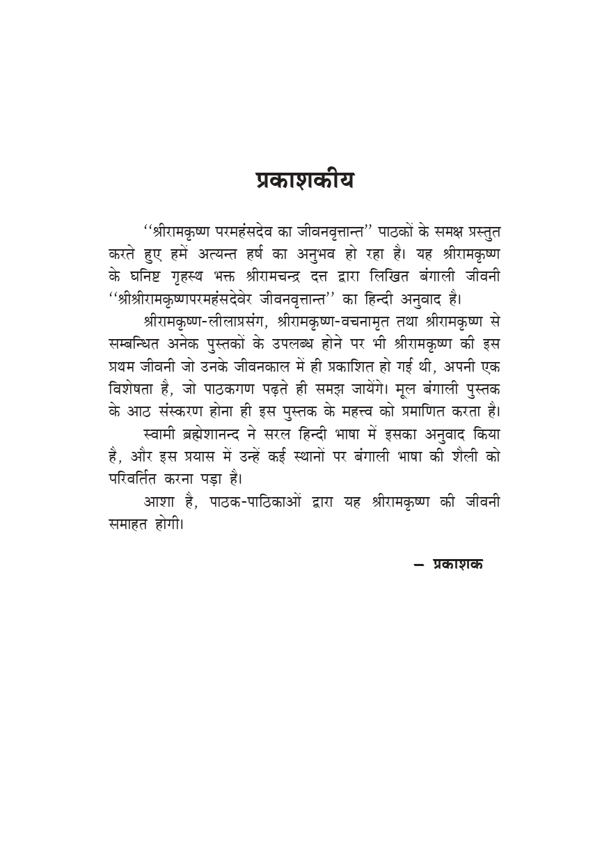 श्रीरामकृष्ण का जीवनवृत्तान्त अमृतकलश के समान है। इसका जितना पाठ किया जाय, उतना ही अमृत-रस का आस्वादन मिलता है। इस ग्रन्थ के द्वारा श्रीश्रीठाकुर के पूत सान्निध्य का काफी मात्रा में अनुभव किया जा सकता है। इसी में इस ग्रन्थ की सार्थकता है।