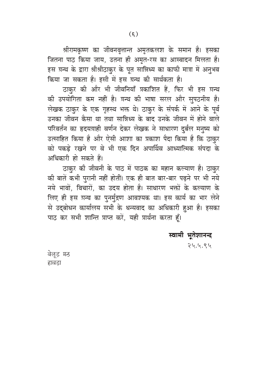 ठाकुर की जीवनी के पाठ में पाठक का महान कल्याण है। ठाकुर की बातें कभी पुरानी नहीं होतीं। एक ही बात बार-बार पढ़ने पर भी नये नये भावों, विचारों, का उदय होता है।