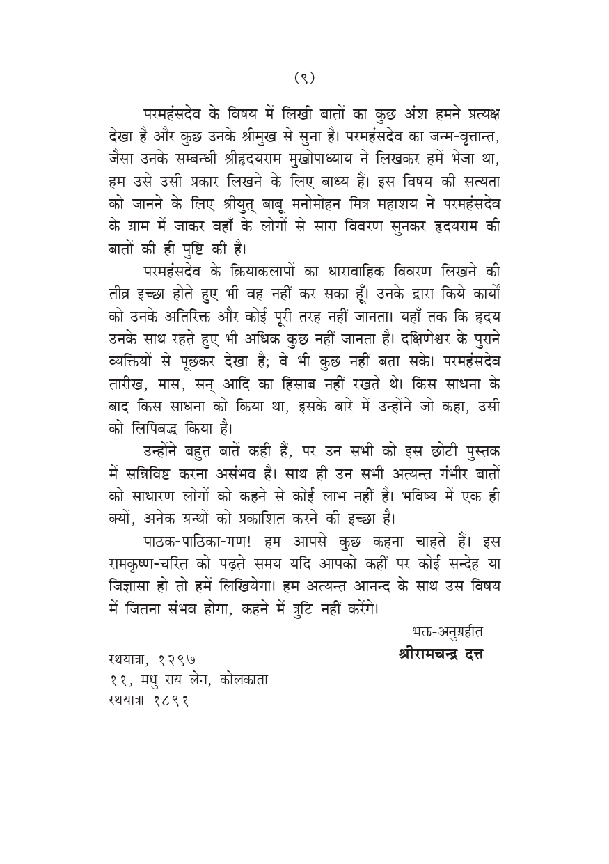 अनन्तभावमय ठाकुर के जीवन के गंभीर रहस्य को समझना साधारण मानव के लिए असंभव है। जो लोग श्रीरामकृष्ण का पवित्र सान्निध्य पाकर धन्य हुए हैं, उनके निर्देश के अनुसार जीवन को उच्च आध्यात्मिक स्तर पर उन्नत कर सके हैं, ऐसे लोगों में भक्त-प्रवर श्रीयुत् रामचन्द्र एक हैं। ठाकुर के अन्तरंग पार्षद के रूप में जाने जाने वाले, जो युग-युग में अवतार के लीलासहचर हैं, वे अवतार के लोक कल्याण के कार्य के सफल रूपायन के लिए जन्म ग्रहण करते हैं। ठाकुर के दूसरे पार्षदों के उनके पास आने के कुछ समय पहले, संभवतः १८७९ ई. से रामचन्द्र दत्त को ठाकुर का सान्निध्य प्राप्त हुआ था, और वे उनकी अपार्थिव कृपा के अधिकारी हुए थे।