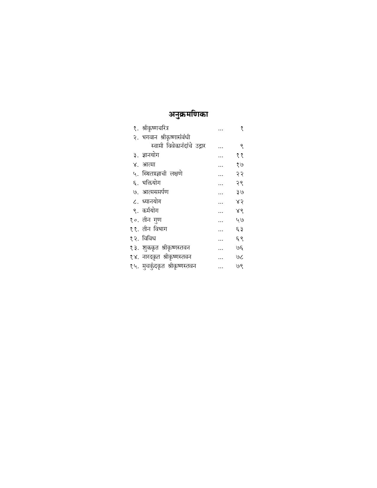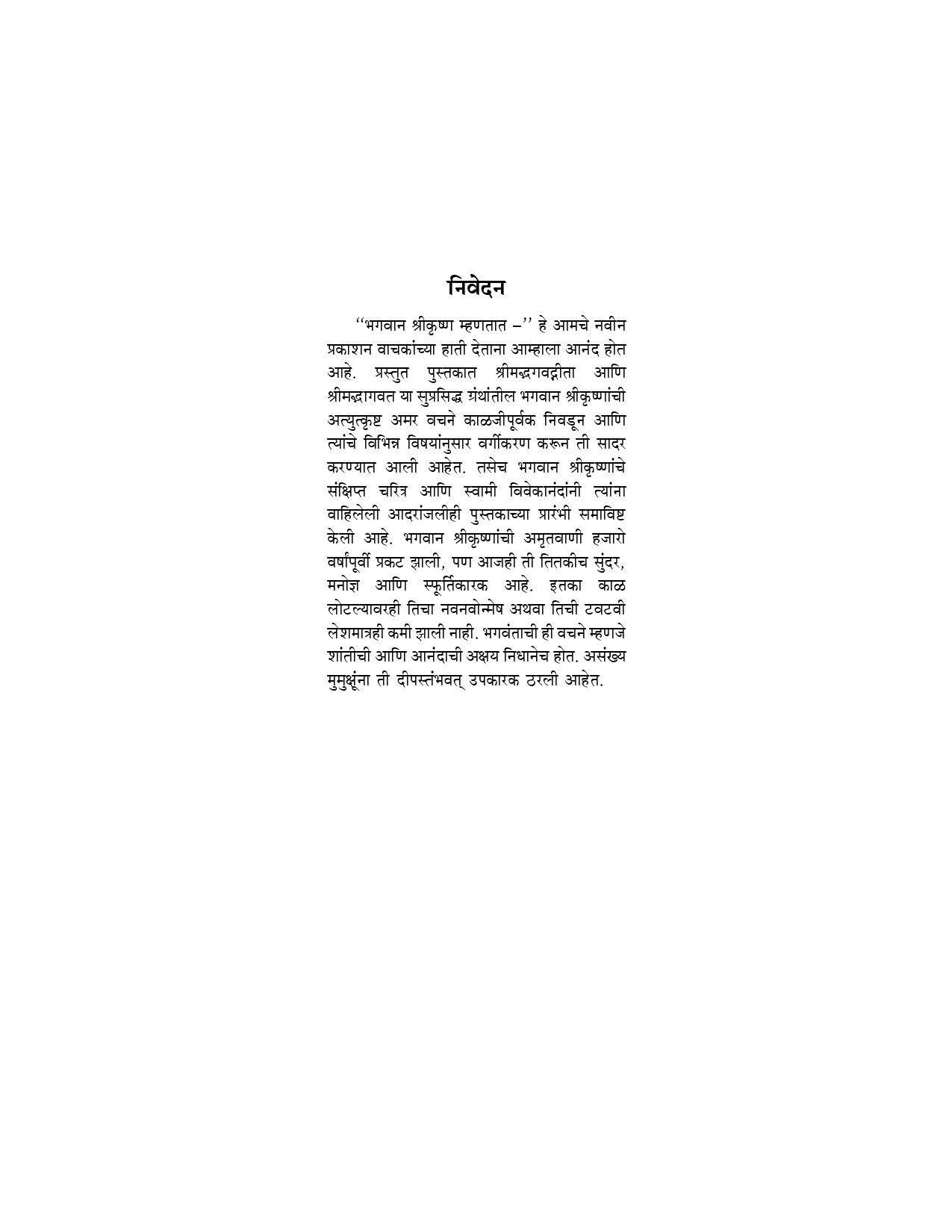 प्रस्तुत पुस्तकात श्रीमद्भगवद्गीता आणि श्रीमद्भागवत या सुप्रसिद्ध ग्रंथांतील भगवान श्रीकृष्णांची अत्युत्कृष्ट अमर वचने काळजीपूर्वक निवडून आणि त्यांचे विभिन्न विषयांनुसार वर्गीकरण करून ती सादर करण्यात आली आहेत. तसेच भगवान श्रीकृष्णांचे संक्षिप्त चरित्र आणि स्वामी विवेकानंदांनी त्यांना वाहिलेली आदरांजलीही पुस्तकाच्या प्रारंभी समाविष्ट केली आहे. भगवान श्रीकृष्णांची अमृतवाणी हजारो वर्षांपूर्वी प्रकट झाली, पण आजही ती तितकीच सुंदर, मनोज्ञ आणि स्फूर्तिकारक आहे. इतका काळ लोटल्यावरही तिचा नवनवोन्मेष अथवा तिची टवटवीतपणा लेशमात्रही कमी झाली नाही. भगवंताची ही वचने म्हणजे शांतीची आणि आनंदाची अक्षय निधानेच होत. असंख्य मुमुक्षूंना ती दीपस्तंभवत् उपकारक ठरली आहेत.
