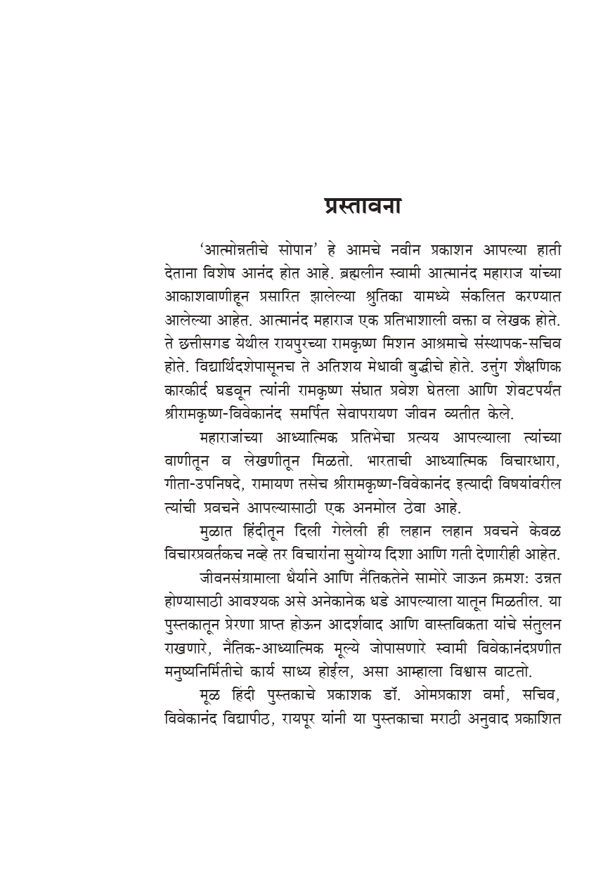ब्रह्मलीन स्वामी आत्मानंद महाराज यांच्या आकाशवाणीहून प्रसारित झालेल्या श्रुतिका यामध्ये संकलित करण्यात आलेल्या आहेत. आत्मानंद महाराज एक प्रतिभाशाली वक्ता व लेखक होते. ते छत्तीसगड येथील रायपुरच्या रामकृष्ण मिशन आश्रमाचे संस्थापक-सचिव होते. विद्यार्थिदशेपासूनच ते अतिशय मेधावी बुद्धीचे होते. उत्तुंग शैक्षणिक कारकीर्द घडवून त्यांनी रामकृष्ण संघात प्रवेश घेतला आणि शेवटपर्यंत श्रीरामकृष्ण-विवेकानंद समर्पित सेवापरायण जीवन व्यतीत केले. महाराजांच्या आध्यात्मिक प्रतिभेचा प्रत्यय आपल्याला त्यांच्या वाणीतून व लेखणीतून मिळतो. भारताची आध्यात्मिक विचारधारा, गीता-उपनिषदे, रामायण तसेच श्रीरामकृष्ण-विवेकानंद इत्यादी विषयांवरील त्यांची प्रवचने आपल्यासाठी एक अनमोल ठेवा आहे.