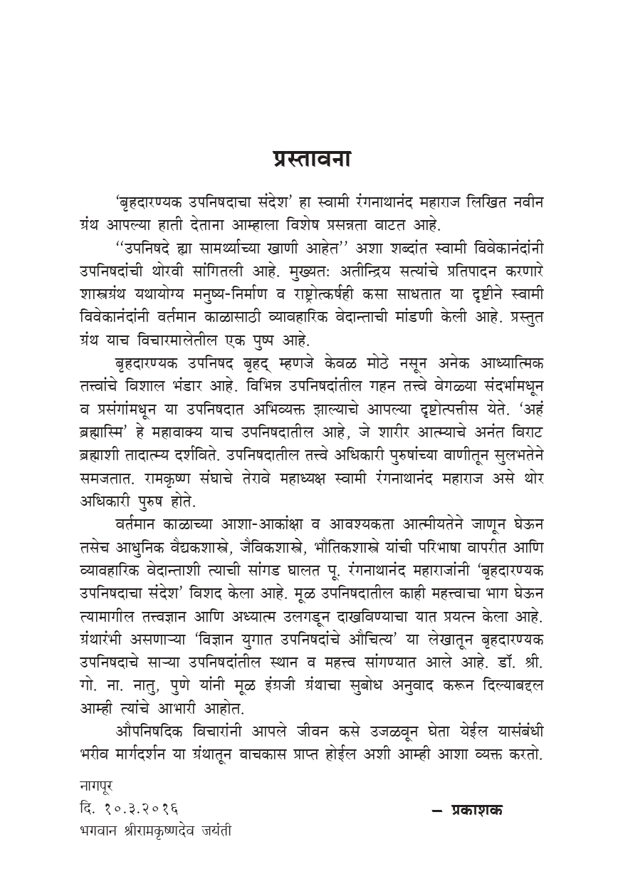 “उपनिषदे ह्या सामर्थ्याच्या खाणी आहेत” अशा शब्दांत स्वामी विवेकानंदांनी उपनिषदांची थोरवी सांगितली आहे. मुख्यतः अतीन्द्रिय सत्यांचे प्रतिपादन करणारे शास्त्रग्रंथ यथायोग्य मनुष्य-निर्माण व राष्ट्रोत्कर्षही कसा साधतात या दृष्टीने स्वामी विवेकानंदांनी वर्तमान काळासाठी व्यावहारिक वेदान्ताची मांडणी केली आहे. प्रस्तुत ग्रंथ याच विचारमालेतील एक पुष्प आहे. बृहदारण्यक उपनिषद बृहद् म्हणजे केवळ मोठे नसून अनेक आध्यात्मिक तत्त्वांचे विशाल भंडार आहे. विभिन्न उपनिषदांतील गहन तत्त्वे वेगळ्या संदर्भामधून व प्रसंगांमधून या उपनिषदात अभिव्यक्त झाल्याचे आपल्या दृष्टोत्पत्तीस येते. ‘अहं ब्रह्मास्मि’ हे महावाक्य याच उपनिषदातील आहे, जे शारीर आत्म्याचे अनंत विराट ब्रह्माशी तादात्म्य दर्शविते. उपनिषदातील तत्त्वे अधिकारी पुरुषांच्या वाणीतून सुलभतेने समजतात. रामकृष्ण संघाचे तेरावे महाध्यक्ष स्वामी रंगनाथानंद महाराज असे थोर अधिकारी पुरुष होते. वर्तमान काळाच्या आशा-आकांक्षा व आवश्यकता आत्मीयतेने जाणून घेऊन तसेच आधुनिक वैद्यकशास्त्रे, जैविकशास्त्रे, भौतिकशास्त्रे यांची परिभाषा वापरीत आणि व्यावहारिक वेदान्ताशी त्याची सांगड घालत पू. रंगनाथानंद महाराजांनी ‘बृहदारण्यक उपनिषदाचा संदेश’ विशद केला आहे. मूळ उपनिषदातील काही महत्त्वाचा भाग घेऊन त्यामागील तत्त्वज्ञान आणि अध्यात्म उलगडून दाखविण्याचा यात प्रयत्न केला आहे. ग्रंथारंभी असणाऱ्या ‘विज्ञान युगात उपनिषदांचे औचित्य’ या लेखातून बृहदारण्यक उपनिषदाचे साऱ्या उपनिषदांतील स्थान व महत्त्व सांगण्यात आले आहे.