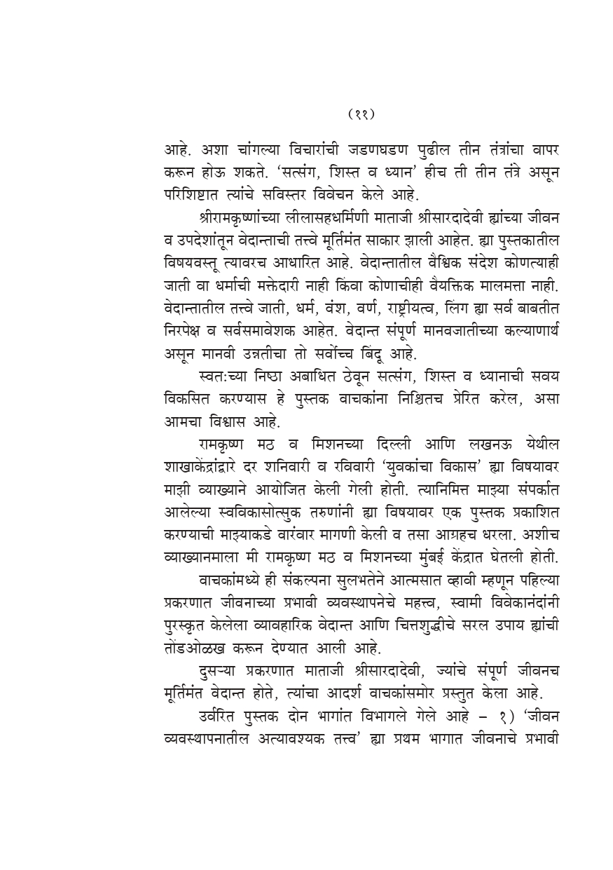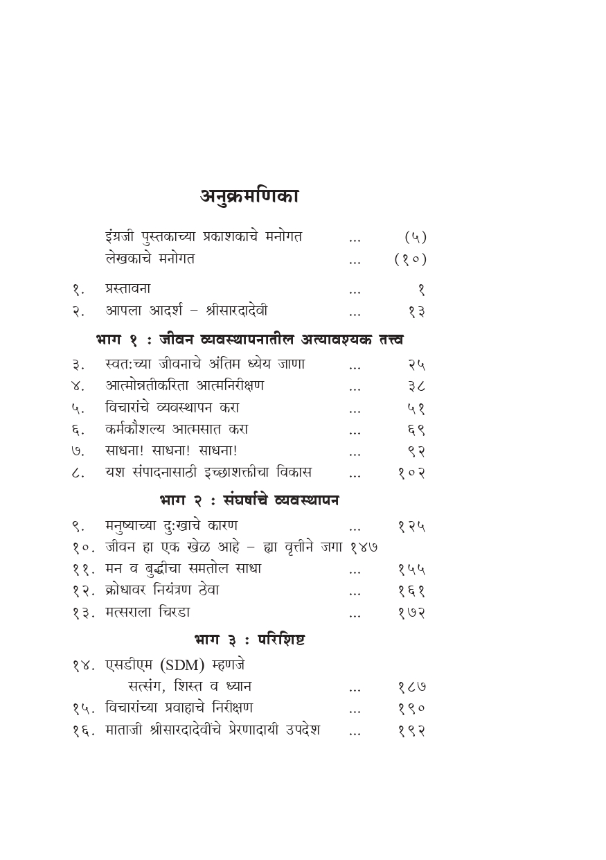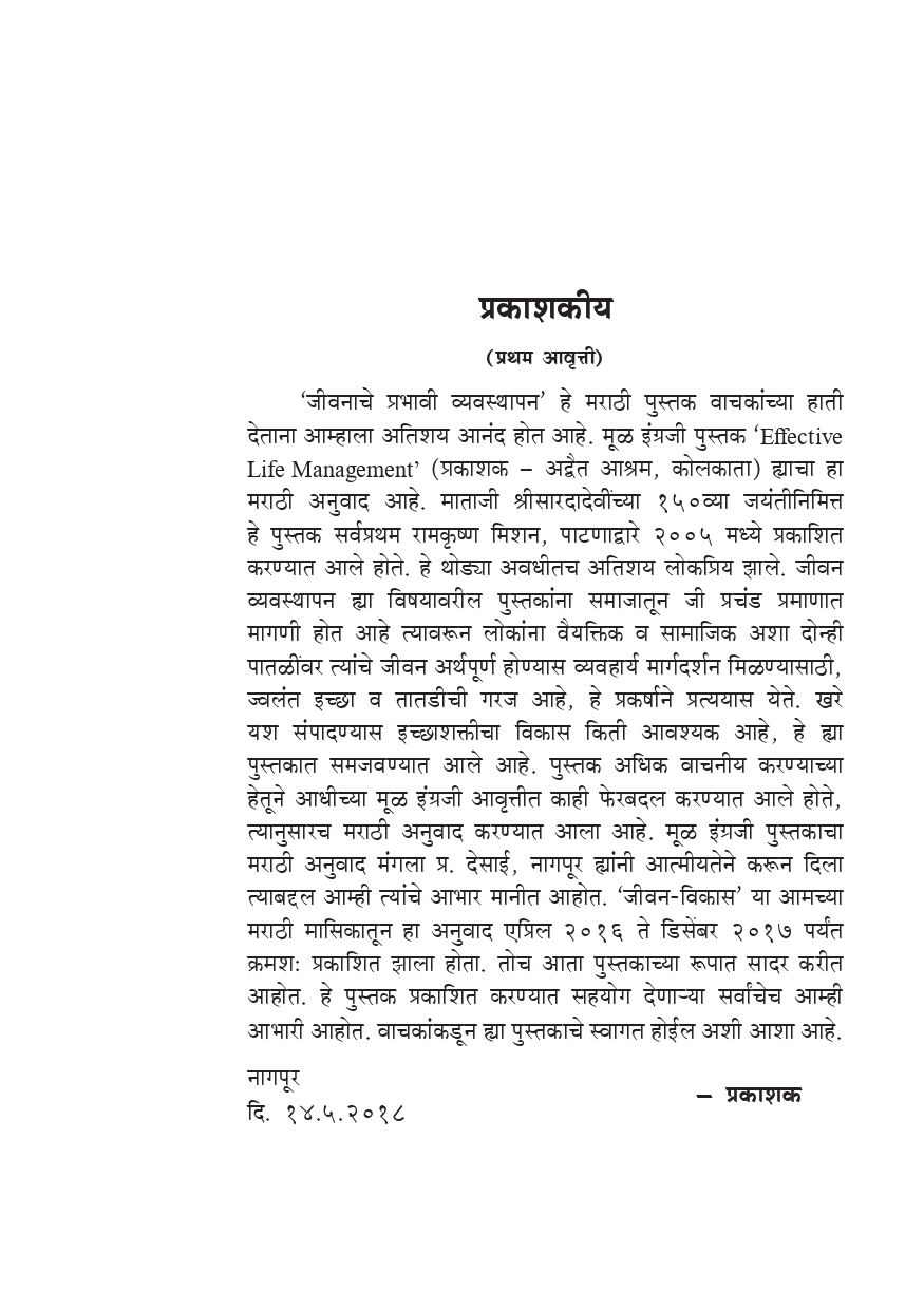 मूळ इंग्रजी पुस्तक ‘Effective Life Management’ ह्याचा हा मराठी अनुवाद आहे. माताजी श्रीसारदादेवींच्या १५०व्या जयंतीनिमित्त हे पुस्तक सर्वप्रथम रामकृष्ण मिशन, पाटणाद्वारे २००५ मध्ये प्रकाशित करण्यात आले होते. हे थोड्या अवधीतच अतिशय लोकप्रिय झाले. जीवन व्यवस्थापन ह्या विषयावरील पुस्तकांना समाजातून जी प्रचंड प्रमाणात मागणी होत आहे त्यावरून लोकांना वैयक्तिक व सामाजिक अशा दोन्ही पातळींवर त्यांचे जीवन अर्थपूर्ण होण्यास व्यवहार्य मार्गदर्शन मिळण्यासाठी, ज्वलंत इच्छा व तातडीची गरज आहे, हे प्रकर्षाने प्रत्ययास येते. खरे यश संपादण्यास इच्छाशक्तीचा विकास किती आवश्यक आहे.
